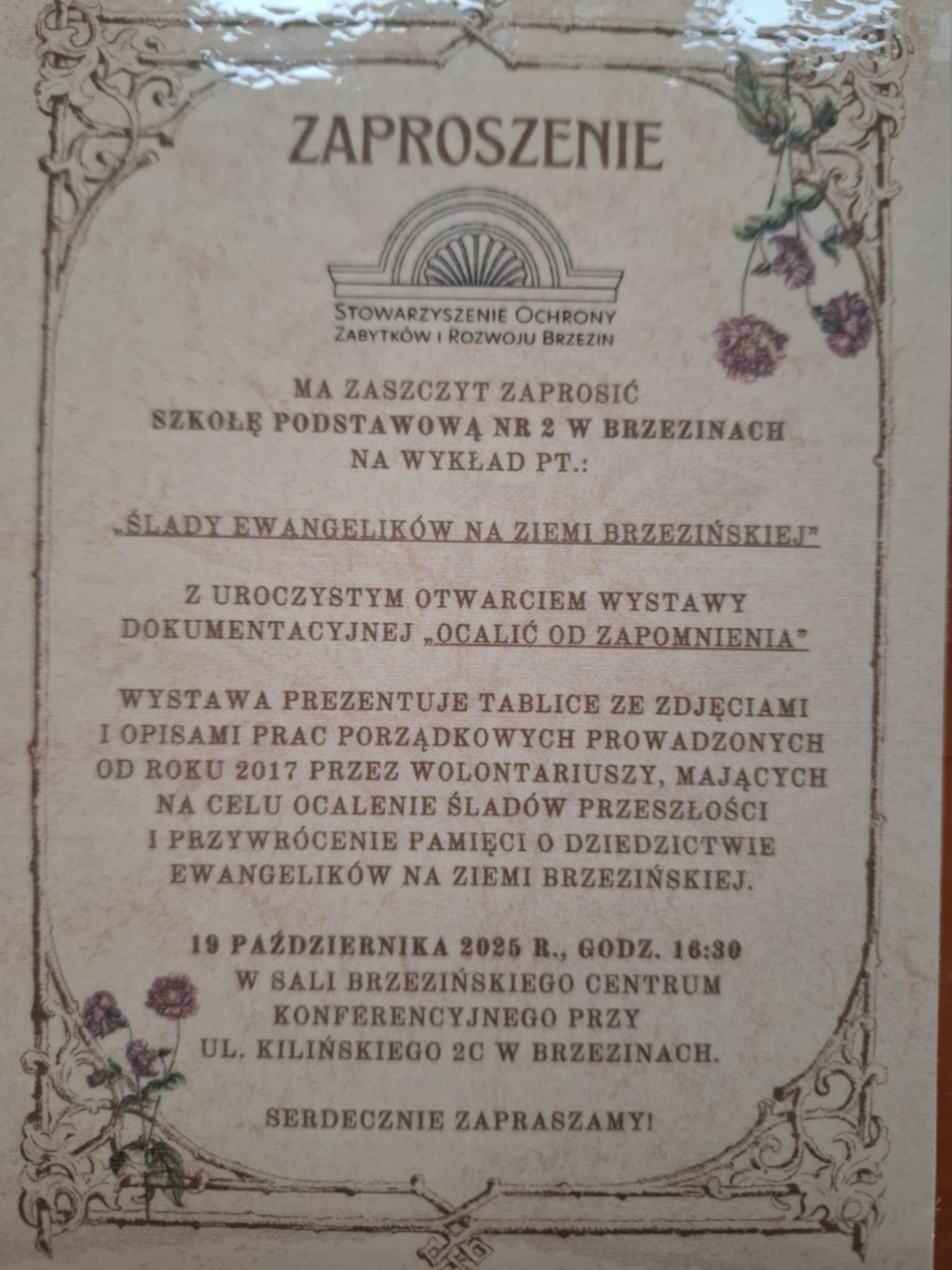 W ramach współpracy Szkolnego Koła Wolontariatu i Stowarzyszenia Ochrony Zabytków i Rozwoju Brzezin uczniowie naszej szkoły wzięli udział w konkursie plastycznym "Zabytki mojej okolicy." Celem konkursu było wzbogacenie wiedzy mieszkańców powiatu brzezińskiego na temat zabytków w ich najbliższej okolicy, budowanie świadomości lokalnej i poznawanie dziedzictwa naszych przodków.